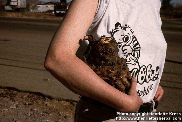 A big old dried Lomatium dissectum root, with me and my Lomatium rash. Bisbee, AZ, US. Processed. 1998-02-01.
