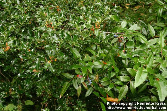 Ilex aquifolium (holly) with ripening red berries and Mahonia aquifolium (Oregon grape) with blue berries. Goslar, Germany. Planted. 2004-09-20.