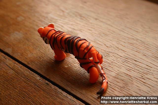 Clay tiger, back view. Helsinki, Finland. Indoors. 2010-01-23.