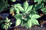 Photo by Deidra Smith: American ginseng. 5 leaves surrounding a stalk in green seeds. 19Aug2006, North Carolina, USA.