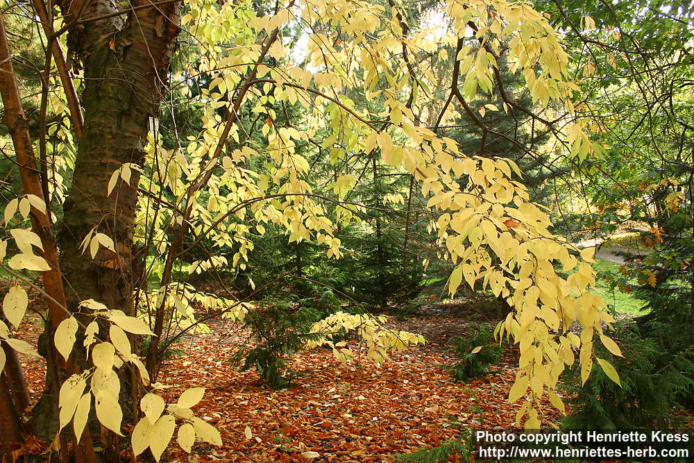 Light yellow fall foliage on elegant curved branches. Botanical garden Kaisaniemi, Helsinki, Finland. Planted. 2004-10-05.