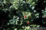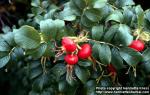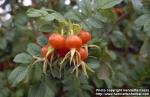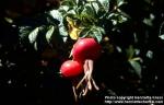 Bush, white flowers and red rosehips. Botanical garden Kaisaniemi, Helsinki, Finland. Planted. 2006-09-29.