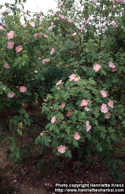 Bush in flower: large simple pink flowers. Rosa gallica? Rosa alba? Viikki rosario, Helsinki, Finland. Planted. 2002-06-12.