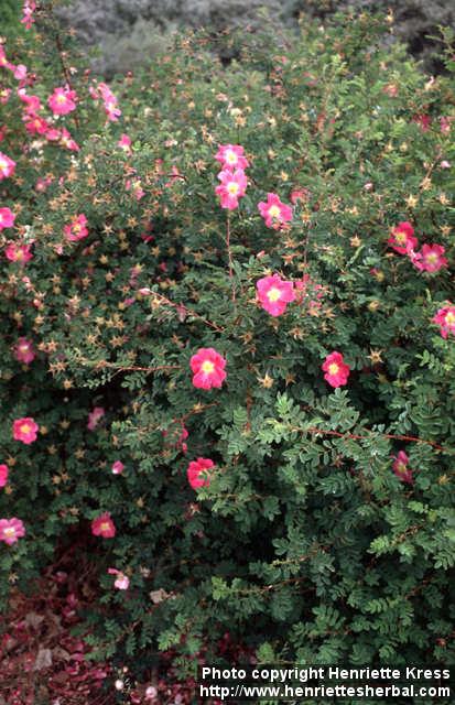 cv. Bush in flower: simple flower, dark pink. Viikki rosario, Helsinki, Finland. Planted. 2002-06-12.