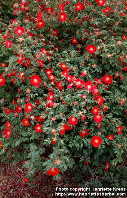 hybr. Bush in flower: simple flowers, red. Viikki rosario, Helsinki, Finland. Planted. 2002-06-12.