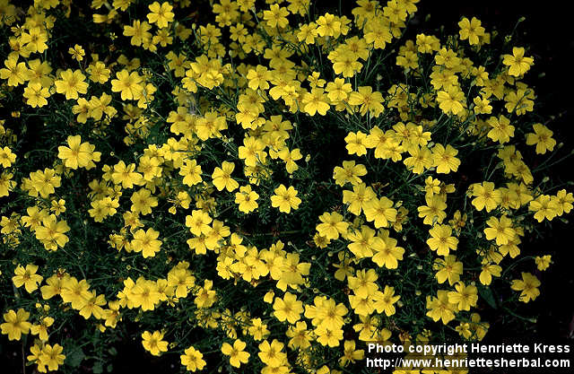 Engl.: lemon marigold, lemon gem marigold, lemon mint marigold, signet marigold, slender-leaf marigold, striped Mexican marigold.