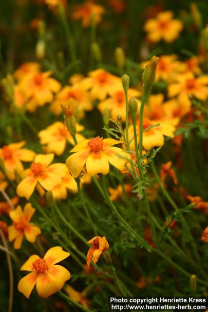 Engl.: lemon marigold, lemon gem marigold, lemon mint marigold, signet marigold, slender-leaf marigold, striped Mexican marigold.