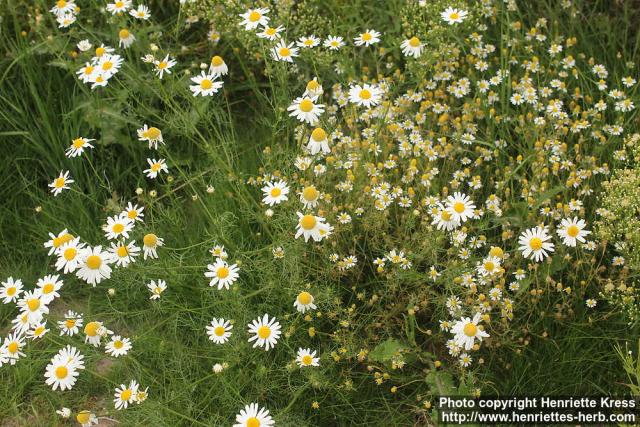 Flowering plants: Tripleurospermum perforatum (larger), Matricaria recutita (smaller). Outside Bergianska trädgården, Stockholm, Sweden. Wild. 2011-07-13.