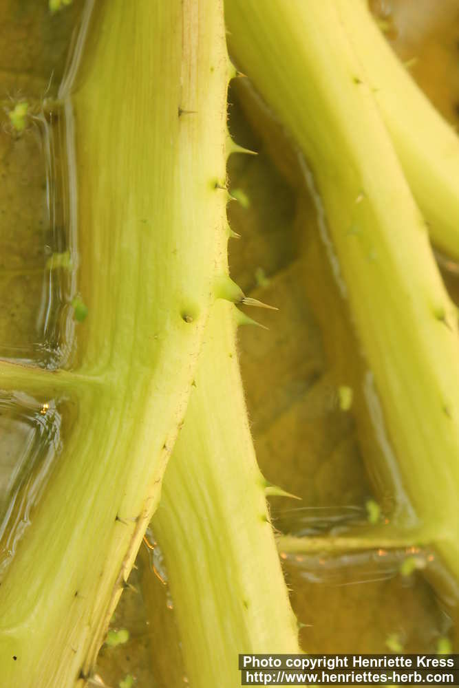 Spines on underside of leaf. Bergianska trädgården, Stockholm, Sweden. Greenhouse. 2012-07-05.
