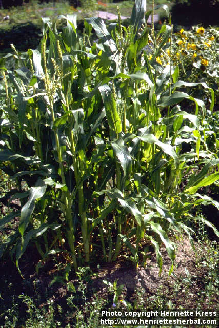 Plants in flower and fruit. The male flower is on top, the female hides in a leaf branch. Annala, Helsinki, Finland. Planted. 1999-08-01.