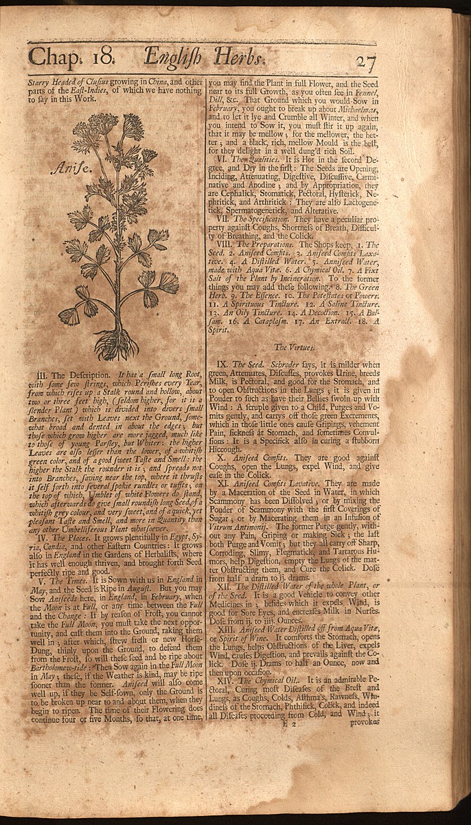 Gallery: Salmon 1710 ProofreadThis is a page from Salmon's Botanologia, 1710. See Chap. 018. Of Anise. Book Navigation ‹ 00062 up 00064 ›
