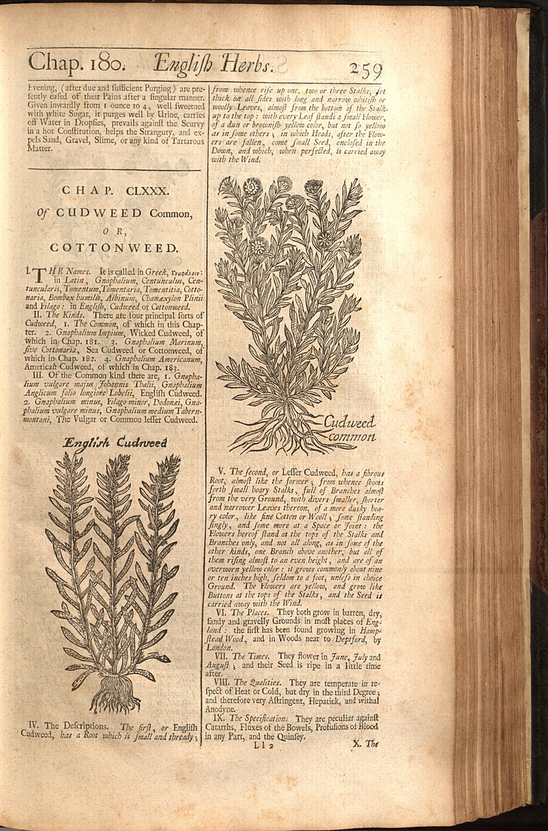 Gallery: Salmon 1710 ProofreadThis is a page to be proofread from Salmon's Botanologia, 1710. See Chap. 179. Of Cucumber Wild. See Chap. 180. Of Cudweed Common, or, Cottonweed. Book Navigation ‹ 00294 up 00296 ›